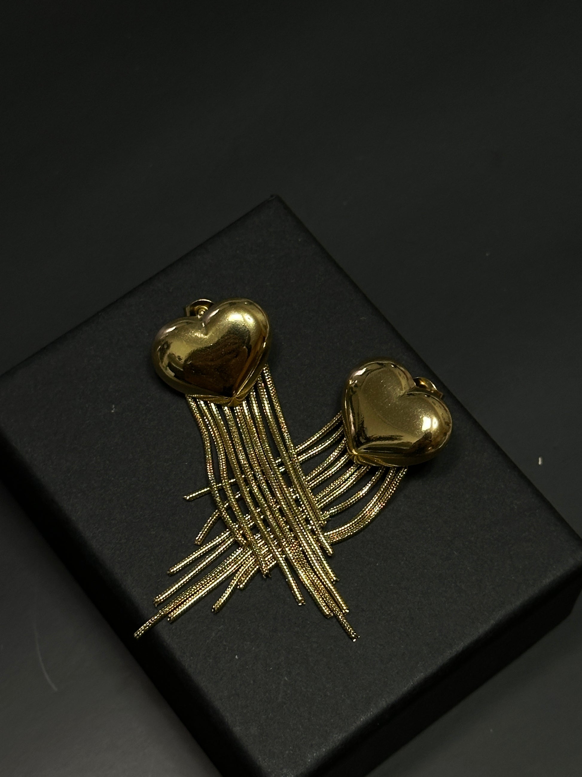 Add a touch of boldness and glamour to your look with our Heart Curtains Earrings. These stunning earrings feature bold gold hearts with long curtain details in a matching gold stainless steel. Elevate any outfit with these eye-catching accessories!