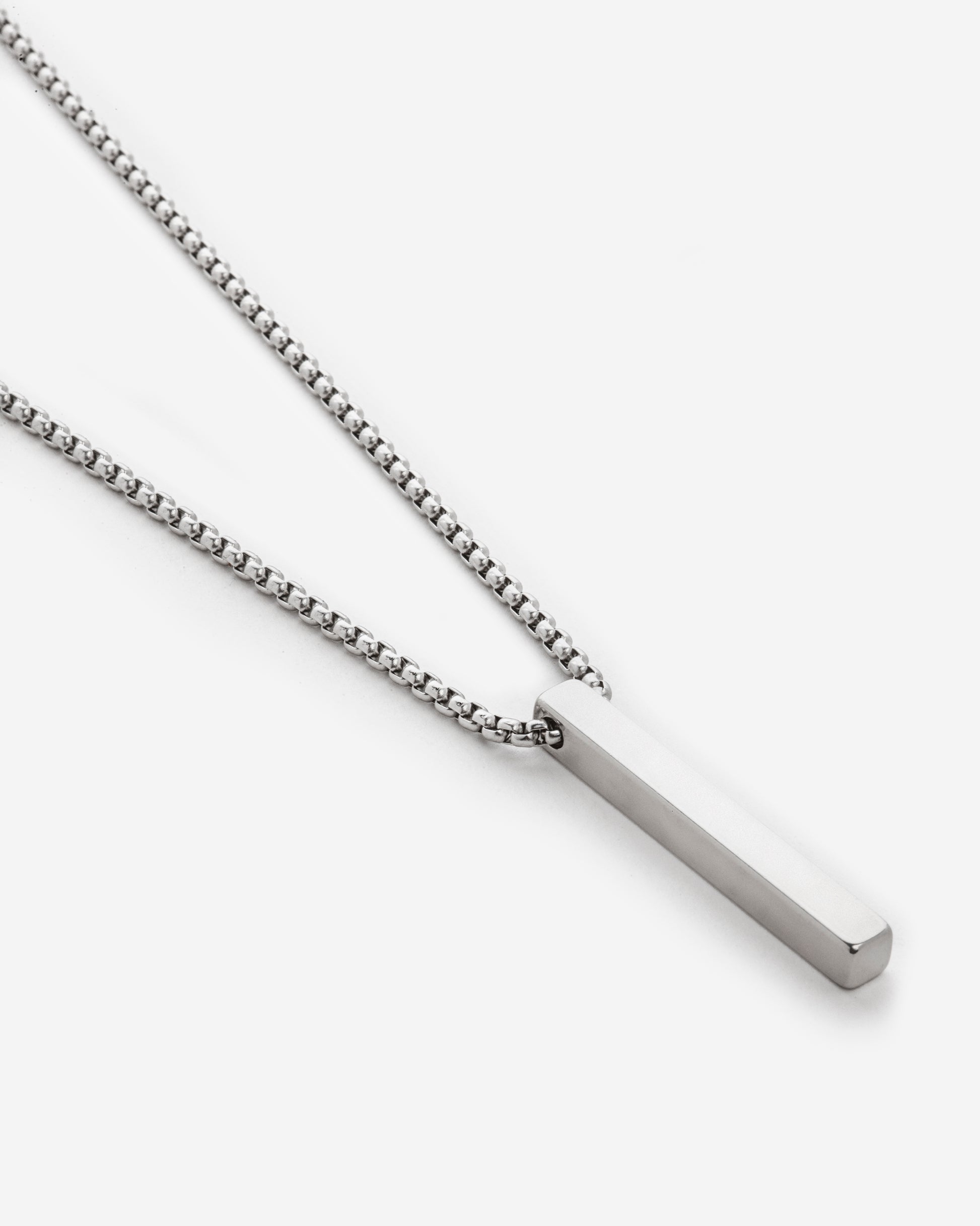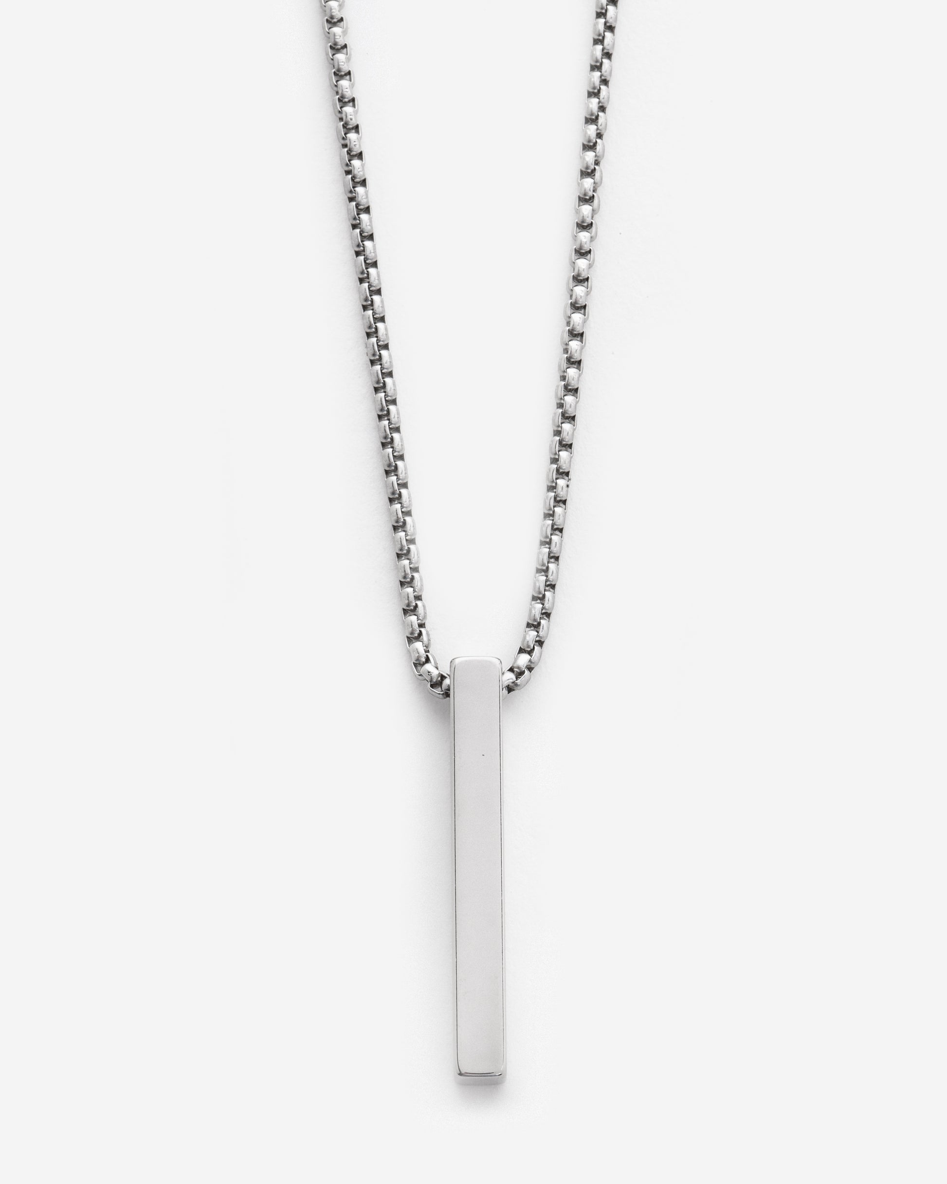 The COLLINS pendant is a stylish accessory that will add a modern touch to any outfit. It is a straight silver rectangle, made from stainless steel for a beautiful finish.